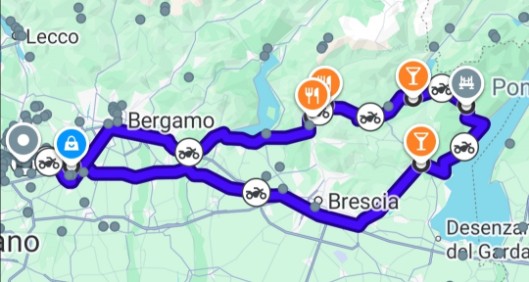 Bellusco-Brembate-Zingonia-Palazzolo sull'oglio-Rovato-Salò-Toscolano Maderno-Gargnano-Novazzo-Val Vestino-Capovalle-Passo San Rocco-Lavenone-Nozza-Londrino-Marcheno-Gardone Val Trompia-Polaveno-Sarnico-Telgate-Lallio-Osio-Canonica d'Adda-Busnago-Bellusco.