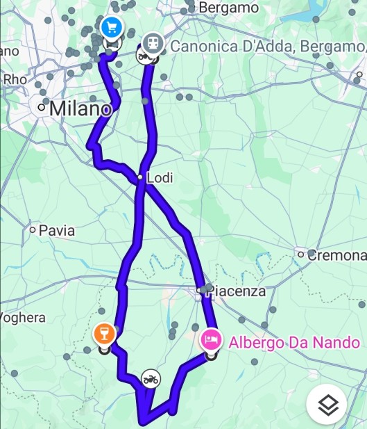 Bellusco-Ornago-Omate-Melzo-Colturano-Sordio-Lodi-Casalpusterlengo-Piacenza-San Giorgio Piacentino-Podenzano-Ponte dell'Olio-Bettola-Perino-Pianello Val Tidone-Agriturismo Locanda La Fornace-Pianello Val Tidone-Borgonovo val Tidone-Castel San Giovanni-Chignolo Po-Lodi-Pandino-Cassano d'Adda-Canonica d'Adda-Busnago-Bellusco.